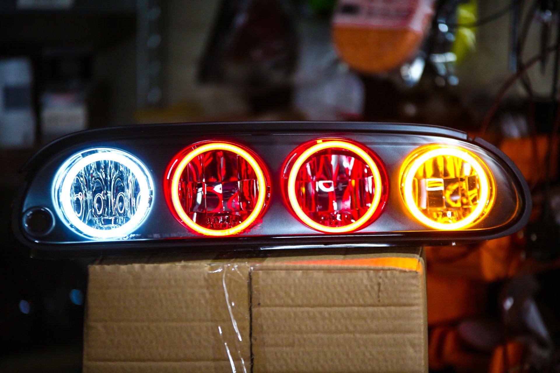 Die roten, gelben und weißen Scheiben werden entfernt und die Chromeinsätze schwarz lackiert. Sie können die weißen Halos sehr deutlich sehen, wenn die Lichter ausgeschaltet sind. Dies ist das einfachste Design und alle Kabel werden versteckt.
